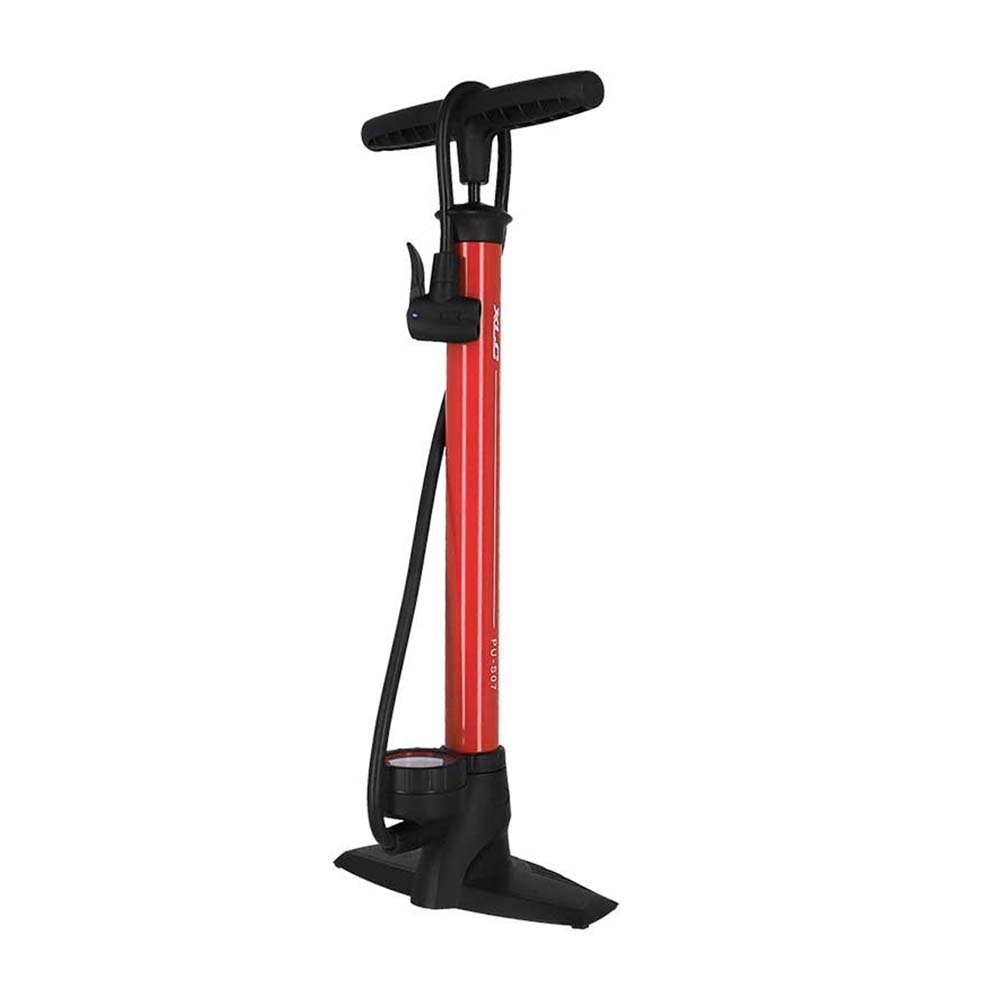 Tukeva jalkapumppu pyöränrenkaiden täyttämiseen. Isosta painemittarista helppo katsoa oikea rengaspaine.